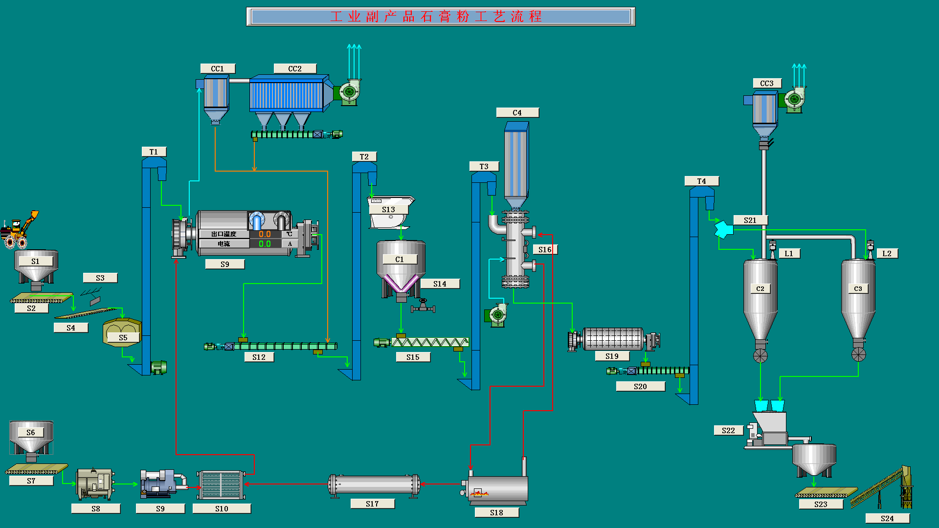 3、采用中溫烘干、低溫煅燒工藝,煅燒設(shè)備換熱面積是天然石膏煅燒設(shè)備換熱面積的1.4倍,得到的產(chǎn)品品質(zhì)各項(xiàng)指標(biāo)比較理想。生產(chǎn)線采用DCS自動(dòng)化控制持術(shù),自動(dòng)化程度高,穩(wěn)定質(zhì)量節(jié)約用工;